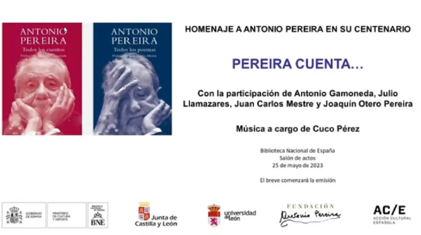 Antonio Pereira González fue un poeta y escritor español, además de un grandísimo narrador oral. Pereira es especialmente reconocido por sus relatos breves. Con este acto homenaje se trata de rendir homenaje al poeta en el año del centenario de su nacimiento y, además, presentar la edición de «Todos los Cuentos» y «Todos los Poemas», editada por Siruela con motivo del centenario. Con la participación de Antonio Gamoneda, Julio Llamazares, Juan Carlos Mestre, Joaquín Otero Pereira y la intervención del músico Cuco Pérez